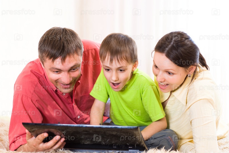Семья из трех человек дома с ноутбуком