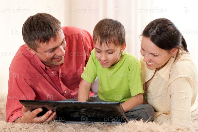 Семья из трех человек дома с ноутбуком