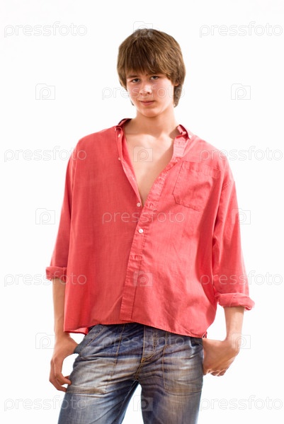 Подросток в красной рубашке на белом фоне