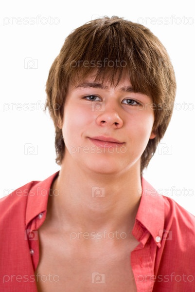 Подросток в красной рубашке на белом фоне