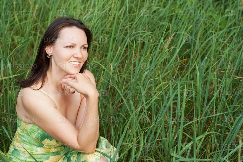 Молодая женщина сидит в траве
