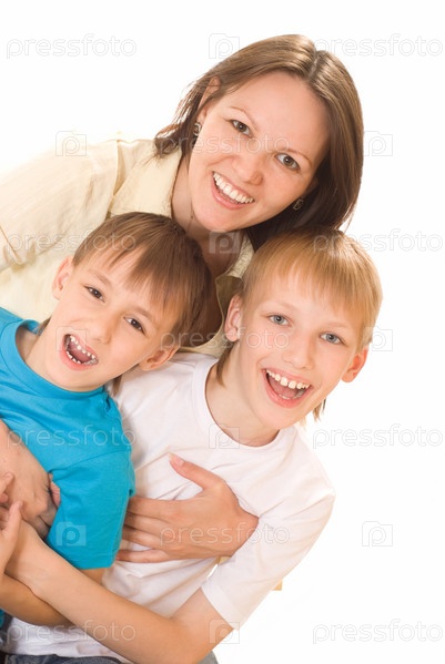 Счастливая мама с сыновьями на белом фоне