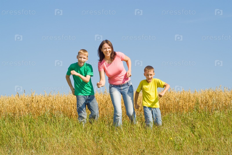 Счастливая мама играет на природе с сыновьями