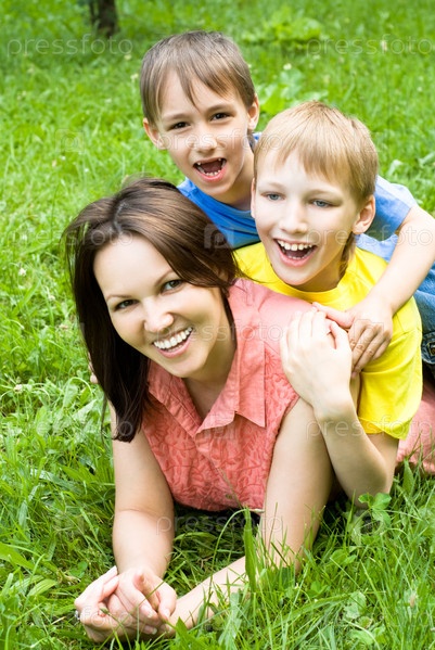 Счастливая мама с сыновьями в летнем парке