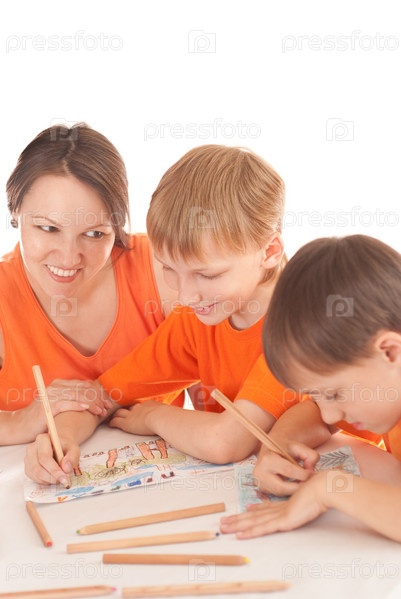 Счастливая мама и сыновья рисуют, сидя за столом