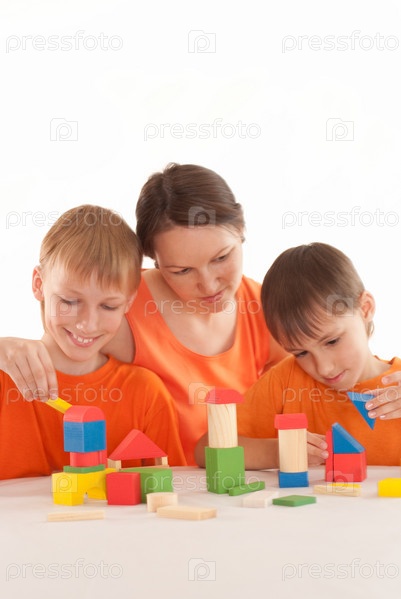 Счастливая мама играет с сыновьями, сидя за столом