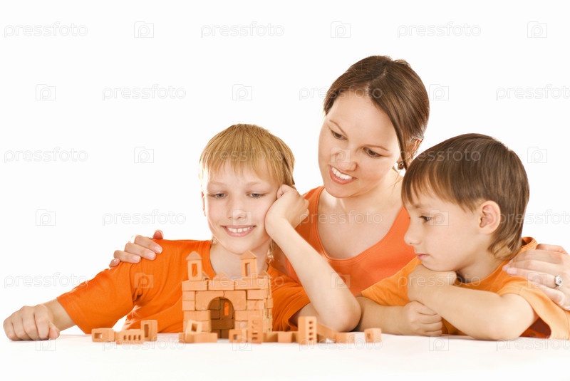 Счастливая мама играет с сыновьями, сидя за столом