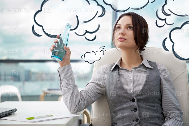 Молодая бизнес-леди фантазирует у себя в офисе