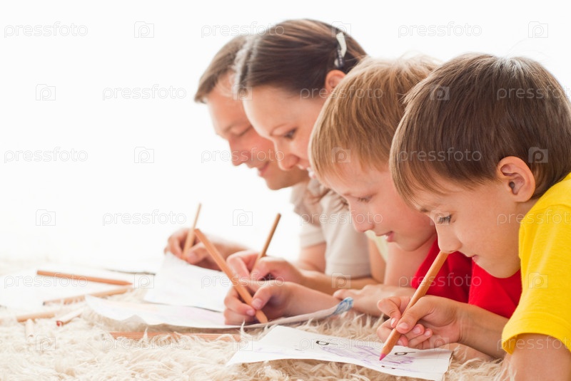 Мама, папа и сыновья рисуют, лежа на полу