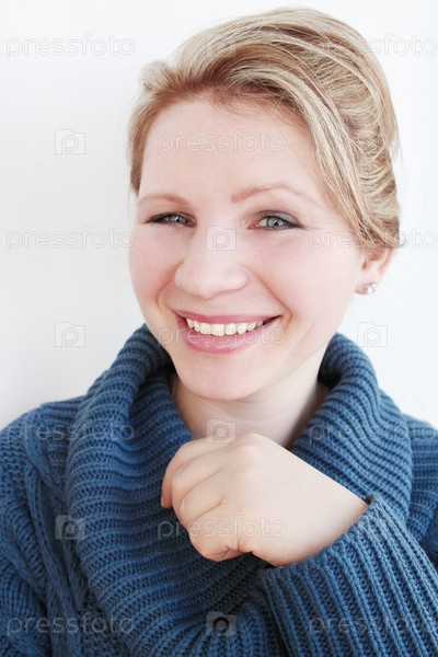 Молодая улыбающаяся женщина в темно-синем свитере