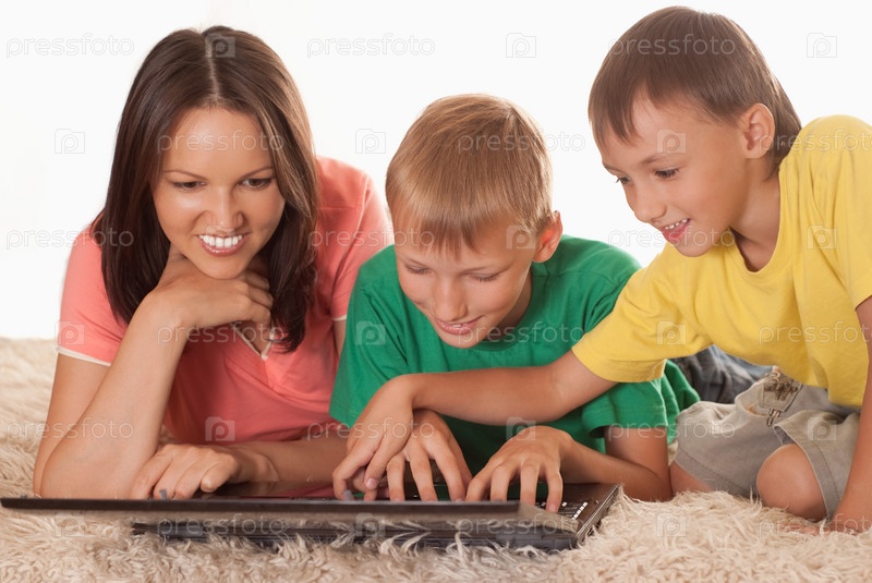 Мама с сыновьями-на ковре с ноутбуком