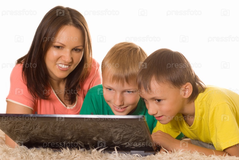Мама с сыновьями-на ковре с ноутбуком
