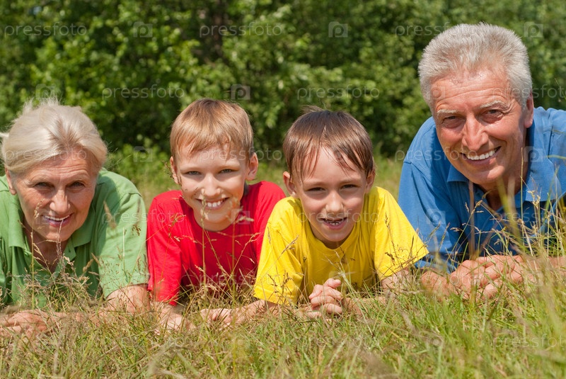 Пожилая пара со внуками лежат на траве