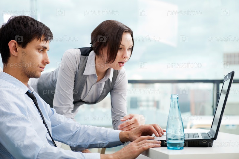 Бизнес-группа, работающая на ноутбуке на белом фоне