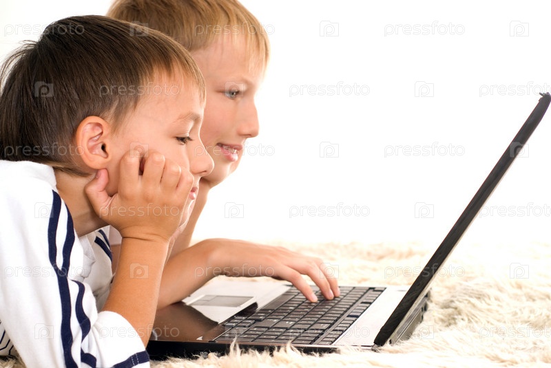 Два брата лежат на ковре с ноутбуком