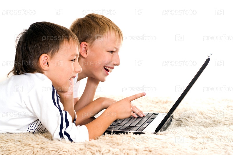 Два брата лежат на ковре с ноутбуком