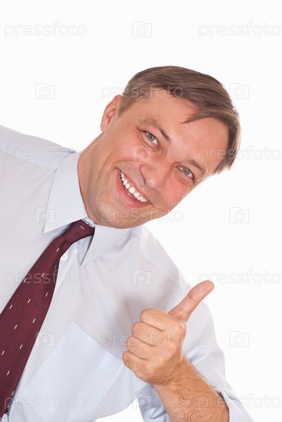 Успешный бизнесмен с большим пальцем вверх на белом фоне