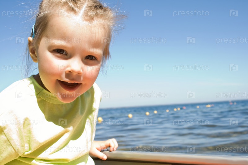 Маленькая девочка смотрит на камеру в солнечный день с голубой водой на заднем плане