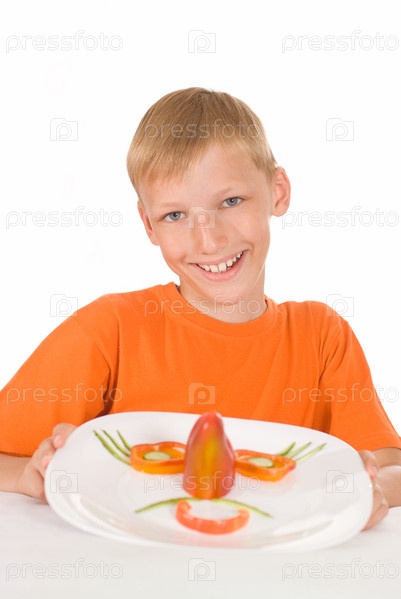 Мальчик сидит за столом и держит тарелку с овощами перед собой