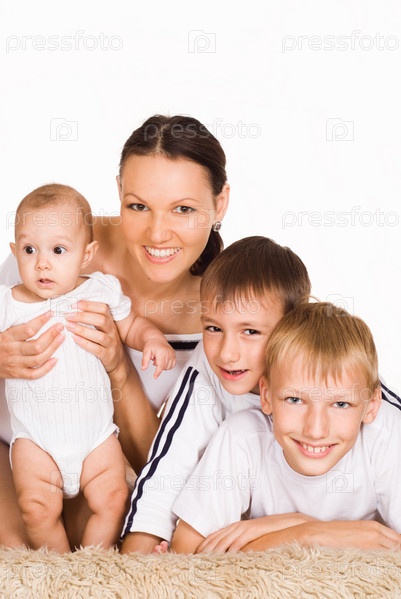 Мать с тремя детьми на белом фоне