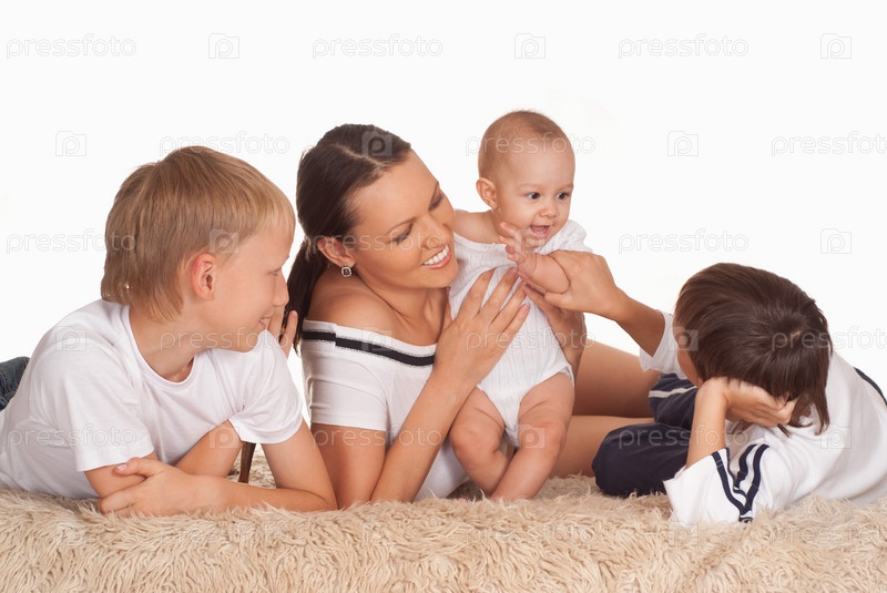 Мать с тремя детьми на белом фоне
