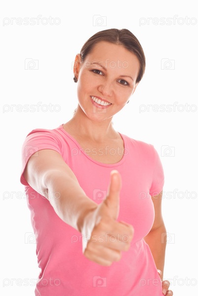 Красивая молодая женщина, показывающая жест ОК, изолированная на белом фоне