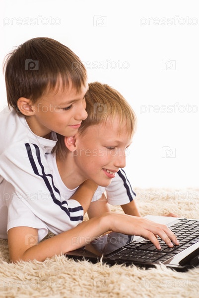 Два брата лежат на ковре с ноутбуком
