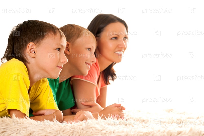 Счастливая мама с двумя детьми на ковре
