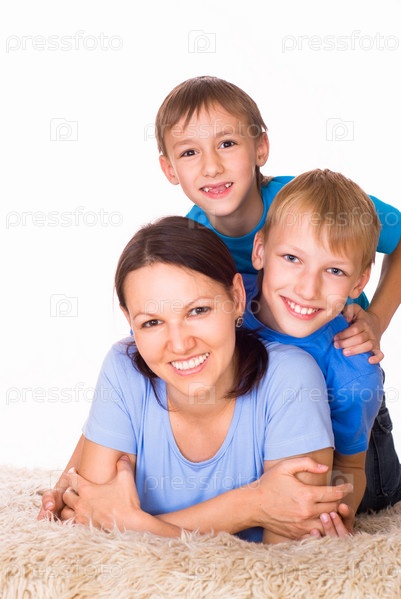 Счастливая мать с детьми лежат на ковре