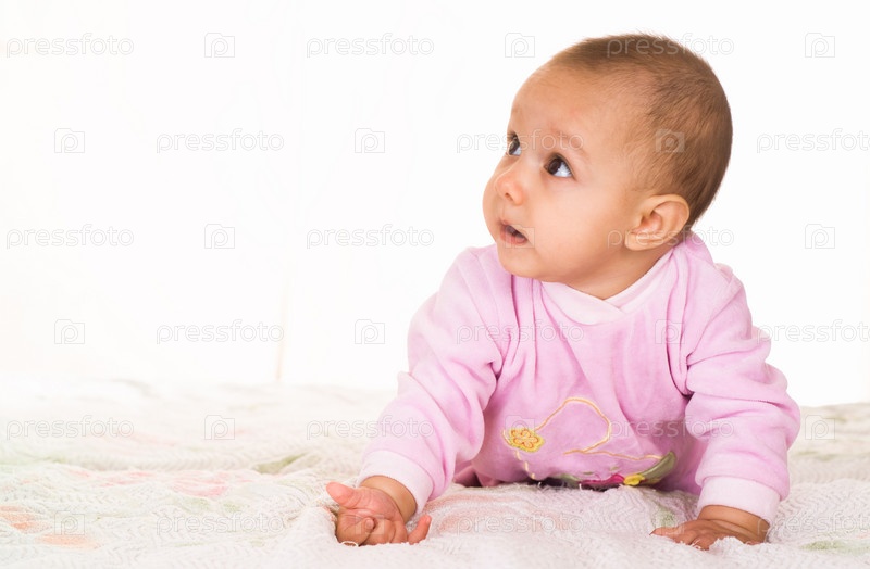 Маленький ребенок в розовом костюме, изолированный на белом фоне