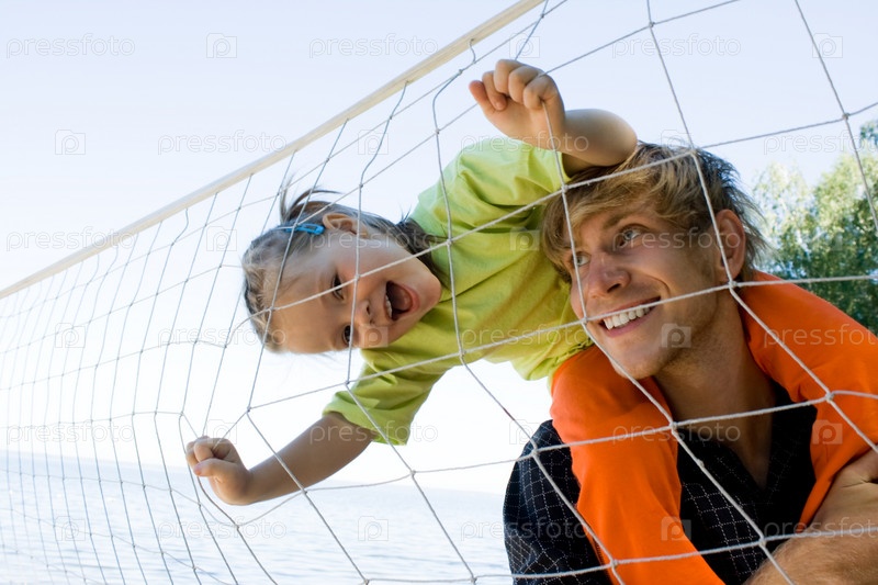 Маленькая девочка смеется над шеей молодого человека и смотрит на камеру через волейбольную сетку