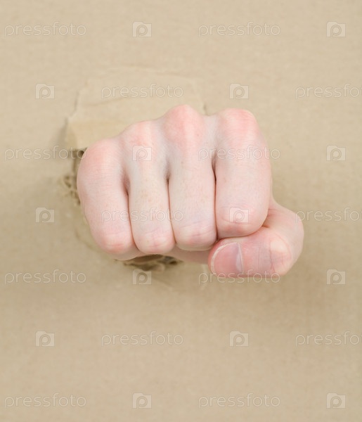 Жест мужской руки через отверстие в картон