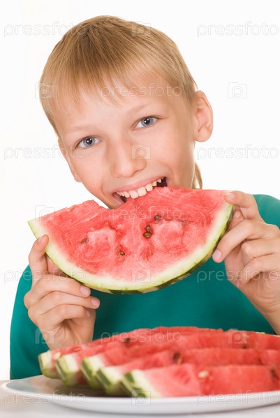 Счастливый мальчик ест сочный арбуз