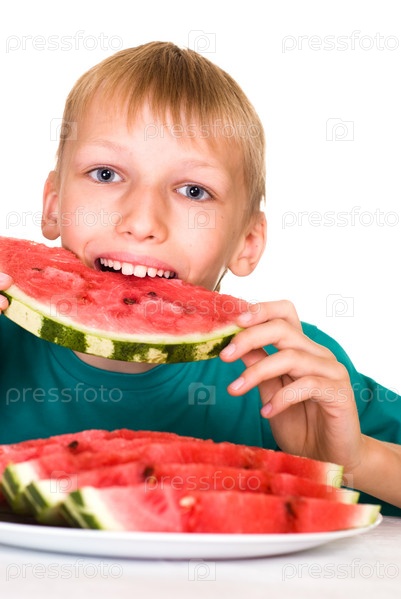 Счастливый мальчик ест сочный арбуз