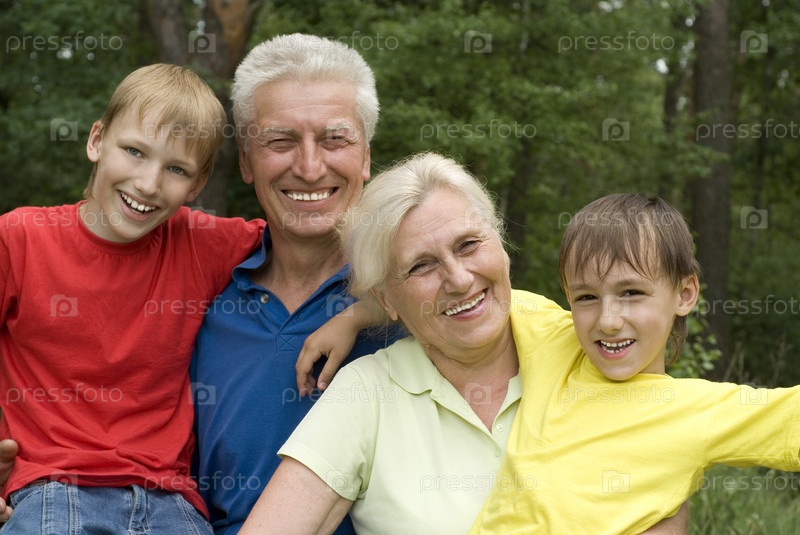 Пожилая пара со своими внуками на фоне зеленого леса