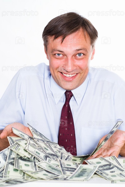 Радостный бизнесмен с кучей денег