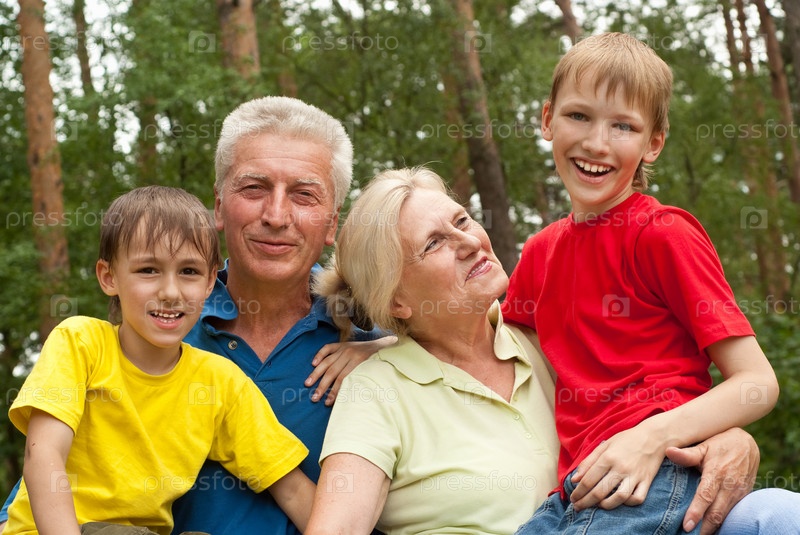 Пожилая пара со своими внуками на фоне зеленого леса