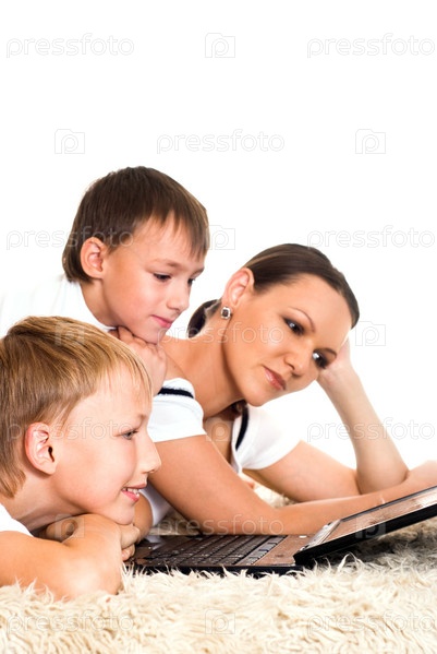 Мать и сыновья лежат на полу перед ноутбуком