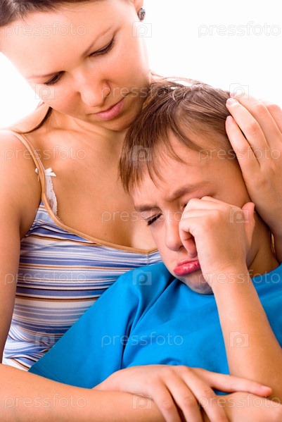 Мать успокаивает плачущего сына