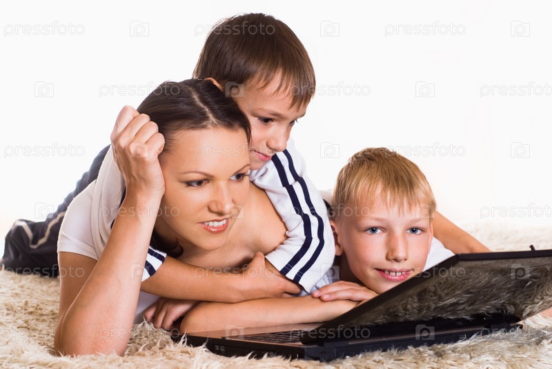 Мать и сыновья лежат на полу перед ноутбуком