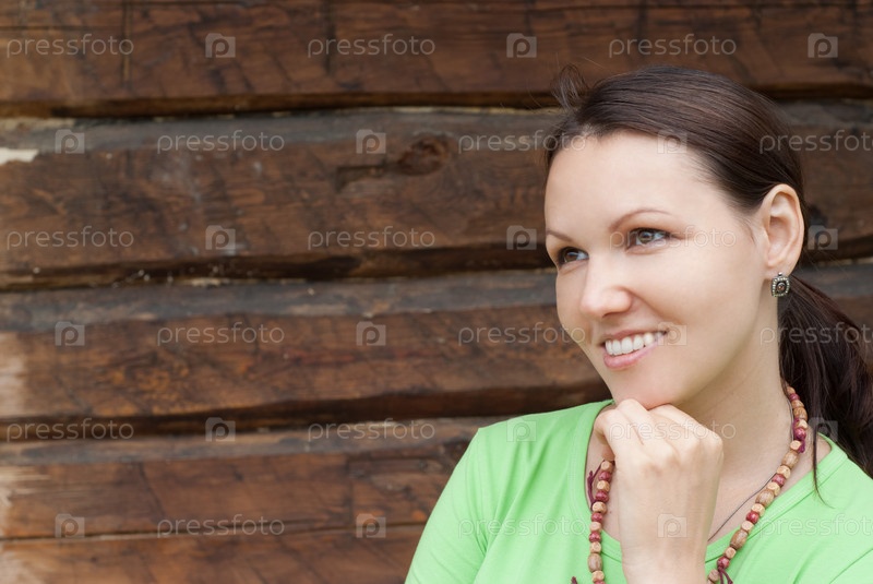 Улыбающаяся женщина на фоне деревянной стены