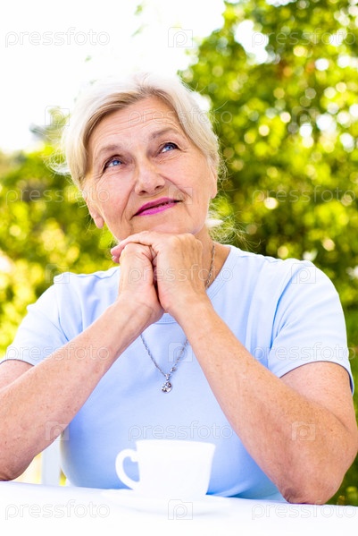 Пожилая женщина пьет чай в саду