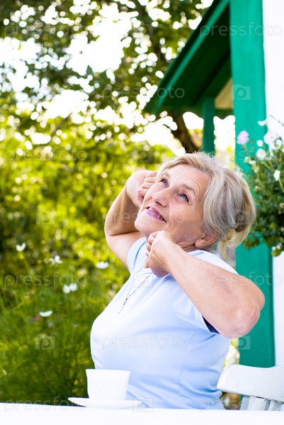 Пожилая женщина пьет чай в саду
