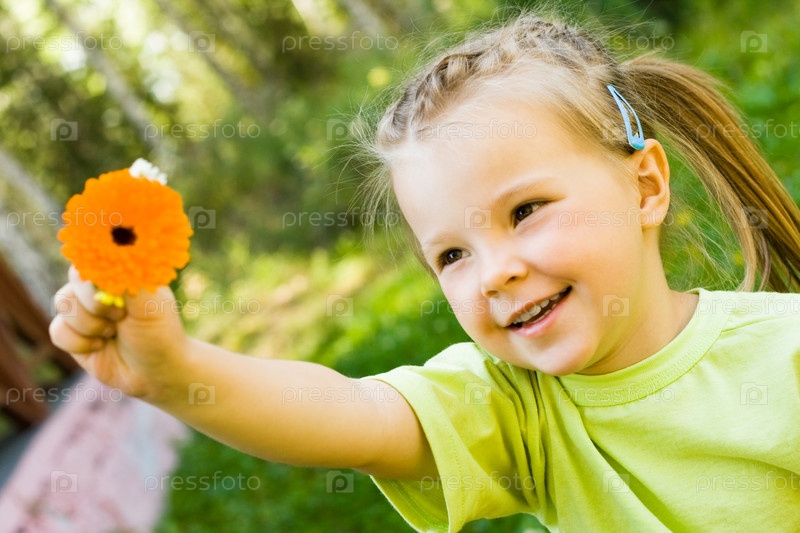 Счастливая девушка, протягивающая руку с красивым цветом в ней