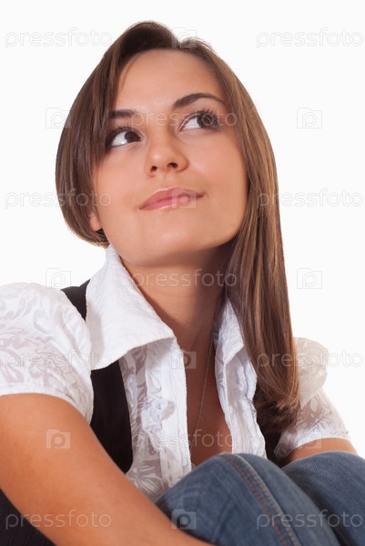Девушка в повседневной одежде сидит на белом фоне