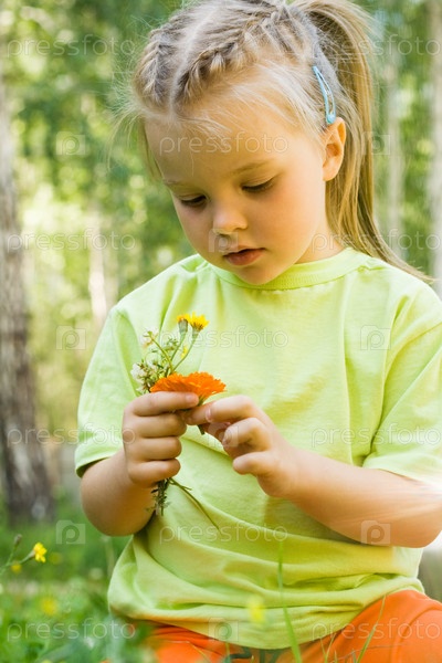 Портрет невинной девочки, глядящей на цветы в руках