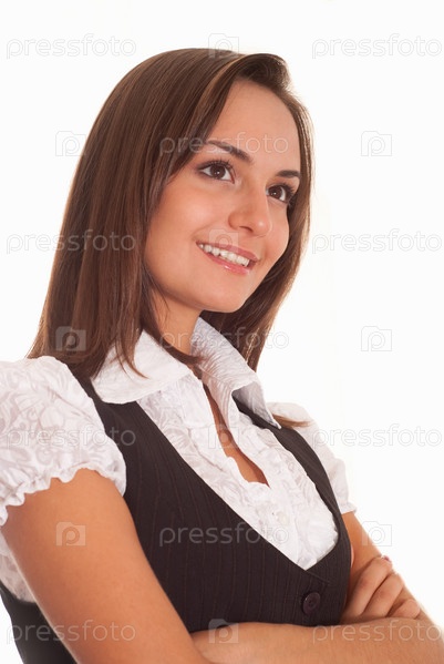 Привлекательная девушка в блузке с коротким рукавом на белом фоне