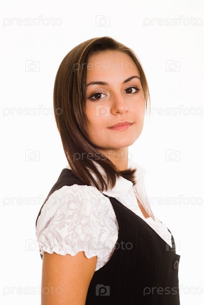 Привлекательная девушка в блузке с коротким рукавом на белом фоне