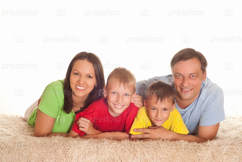 Семья из четырех человек лежит на ковре
