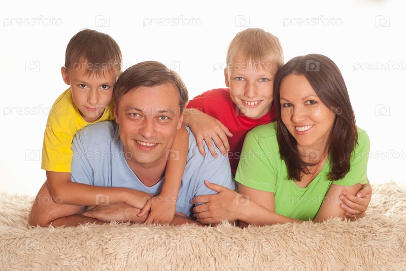 Семья из четырех человек лежит на ковре
